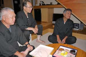| しけった煎餅 誰が持ってきたのかしけった煎餅。 酔っぱらって平気で食べちゃった。 左から井上、斎藤、小沢の各氏。 |