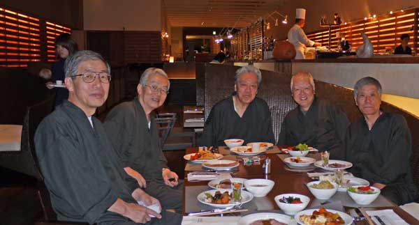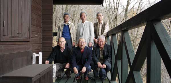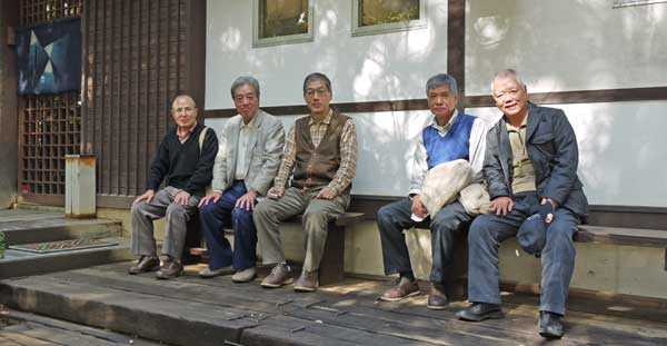 | 作無衣が似合う面々 食い気より飲み気のじいさん達。左から小山、小松、鈴木、井上、小沢の前期高齢者達。 |