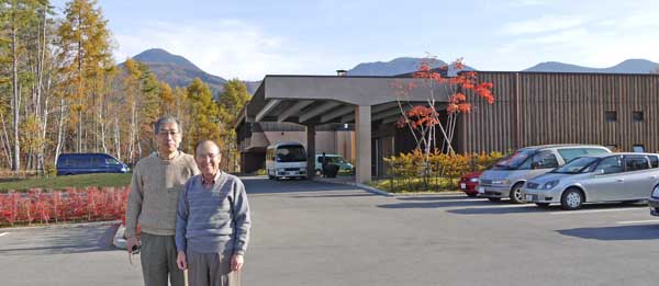 | テラス蓼科 今夜の宿はトヨタの保養施設テラス蓼科だ。素泊まりなら1泊5千円で泊まれる。大浴場の温泉は透明なナトリューム泉。露天風呂から八ヶ岳が見渡せ、夜は星が降るように近くに見える。 蓼科山とテラス蓼科をバックに記念撮影。小山氏と斎藤氏。渓流釣りの師弟でもある。 |