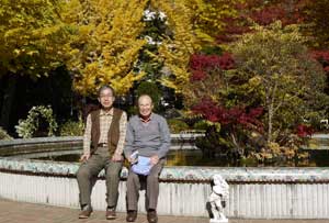 | 紅葉をバックに 美術館の駐車場の桜の紅葉がきれいで、旅のフィナーレは3日間続いた晴天に感謝して、はいポーズ。 |