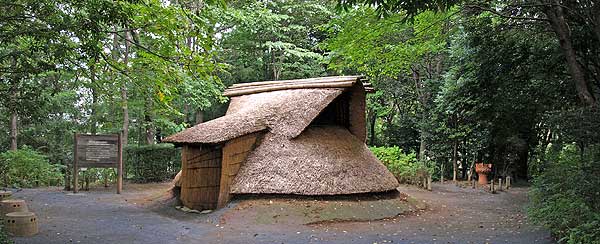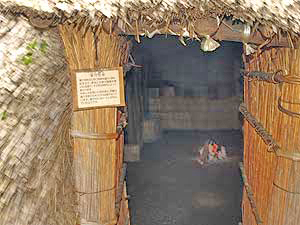 | 縄文前期の竪穴住居 大型の復元住居。縄文人がしたように、家の中の炉では防腐と防虫を兼ねて1年中火を 焚いている。しかし、夏は40度を超え、ほとんどサウナ状態だ。年中火を焚いているのは 現実的でない。夏は熾火程度にして、煮炊きは外でやっていたのであろう。 |