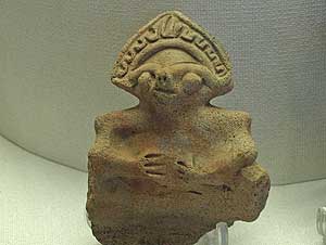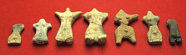 | 縄文中期の土製品(BC3,000~BC2,000) 人の形をしたもの、動物の形をしたものなどいろいろな土製品が作られた。祭に使ったのであろうか。宝飾品の種類も多くなる。 |