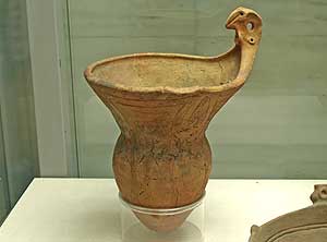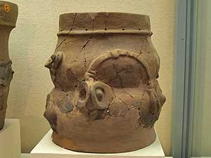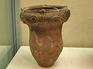 | 有孔鍔付土器 土器の縁に鍔がありそれに小さな穴が あいている。形が太鼓のように膨らんで いるので、上に皮を張って太鼓にしたの だろうか。酒を造った器という説もある。 |
