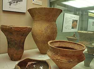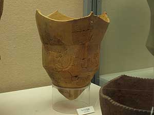 | 縄文早期の土器(BC8,000~BC4,000) 底が尖った尖底深鉢が主体で、撚り糸文を施したものから、細かな沈線文による装飾、さらに貝殻などでつける条痕文を施すものへと変化していく。 |
