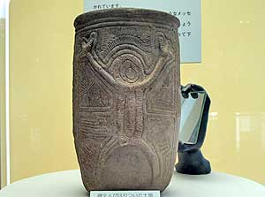 | 加曽利E式土器 千葉県の加曽利貝塚を標識とする土器で、口縁部に渦巻き状またはS字状の文様がつけられ、胴部に縄文がつけられる。 |
