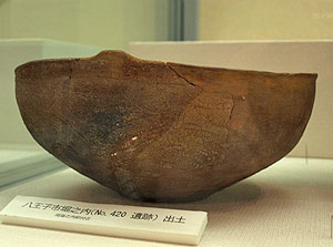 | 縄文中期の土器(BC3,000~BC2,000) 中期になると器形も深鉢、浅鉢のほか、釣手土器など様々な用途に応じた土器が作られる。種類、量ともに隆盛を極める。この期の古い層からは、勝坂式と呼ばれる土器が、その上の新しい層からは、加曽利E式と呼ばれる土器が大量に出土する。 |