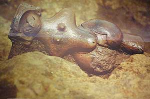 発掘状態 墓と思われる土坑の中に埋められていた。右足が上下逆に置かれているので、埋めた時にすでに右足は壊れていたと思われる。 |