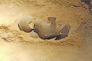 発掘状態 環状広場の中央の小さな土坑に、ほぼ完全な形で、横たわるように埋められていた。約5千年前の縄文中期に作られたものである。 |