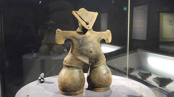 | 正面の像 安定感のあるどっしりとした造形である。安産を祈ったのであろうか。粘土の紐を積み上げて作っているので中空である。 |