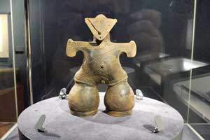 | 後ろ姿 頭の頂部は平らで、渦巻き状の文様が刻まれている。腰回りはどっしりとしていて、妊娠した女性を表しているのだろうか。 |