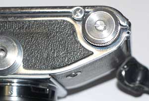 次に巻き戻しノブの中央を押し込む。これをしないと巻き上げているつもりでも、空回りしているので要注意。中央部分を押し込むことによって、パトローネにかみ合う。その上でシャッターダイヤルの手前にある小さなボタンを押しながら、巻き戻しノブを回すと巻き戻される。