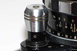 絞りリングで絞りを合わせる。レンズ左の絞りセットリングを回して、グリーンのマークを合わせると、絞りは開放になる。このリングを押すと絞りが絞られ、さらに押し込むとシャッターが切れる。要はデジタルカメラのシャッターボタン半押しの効果を、メカニカルに実現しているわけだ。70年前のメカは実に面白い。