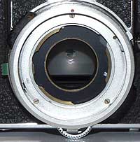 マウントの下のギヤを回し、ボディー側のピンでレンズ側の絞りを制御する。 |