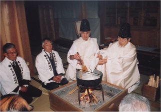 | 置炭・粥占神事 1月14日に行われる。(安房神社橋本権禰宜提供) |