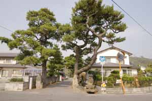 | 参道入口 かなり大きな2本の松の木が巨大な門の ように立っている。 |