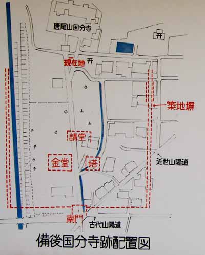 | 備後国分寺配置図 参道の一番奥に掲示されてあった。 昭和四七年(1972)以降の発掘調査の結果、 二町四方の寺域に、南門、塔、金堂、講堂が 法起寺式の配置に並んでいるのが検出されたとある。 |