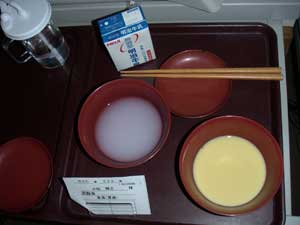| 2005.12.23 | 金 | 5時半起床。8時朝食。お粥、アミの佃煮、チクワ。豆腐のみそ汁。低残渣食。塩分7g。 9時40分血圧の薬アムロジン5m。 10時20分麻酔科の医師から麻酔の説明受ける。背中と全身だって。なんだか怖いな。 体温35.9。昼、お粥300g、フ、イワシのつみれ入り澄まし汁。リンゴジュース。 夕食お粥、ヨーグルト、カボチャのプリン、タラのクリーム煮。9時消灯。 1時半目覚めて読書。 |