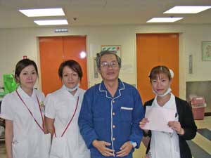 | 2005.12.31 | 土 | 今日は大晦日。体温36度2分。血圧70ー128。朝、3分粥、みそ汁、梅干し、ニンジンの煮物。牛乳。傷の消毒。恭子、史生子来る。 昼、5分粥、豆腐、コーンスープ、ポテトサラダ。ジュース。恭子に頭を洗ってもらう。 佐藤医師、抜糸2日ぐらいかと。1時半二人帰る。血圧の薬飲み始める。3時頃まで寝る。 同室のIさんと話す。クモ膜下出血で手術。奇跡的に後遺症無く全治。次に胸で入院して、もう4カ月も入院してるって。今日家へ帰りたいと頑張る。家族が病院にいなさいと説得している。医師は一時帰宅OKしてるのに、なんだかかわいそう。結局家族が折れて、一時帰宅。 この病棟は14人が年越しだって。普段は30人なのに、みんな正月は家で迎えたいんだね。ナース達もちょっとくつろいでいる。BSで久しぶりのやすきよ。面白い。 夕食、5分粥。みそ汁、煮物、いわし。フルーツ、ヨーグルト。体温36度。血圧70ー123。 8時過ぎ大晦日に宿直になった、不幸な佐藤医師とナース達と一緒に記念撮影。