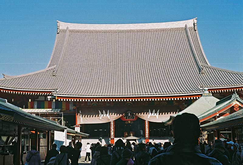 工事中の覆いが取れて、新年を迎える観音堂。行き交う人も笑顔だ。それにしてもこのカメラの巻き上げは固いなあ。