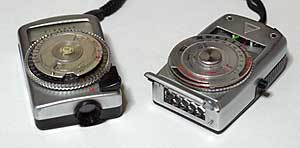 次に電気露出計が出てきた。セレンや硫化カドミューム(CdS)、シリコンフォトダイオードなどを使い、光の量を電気信号に変える仕組みで、現在はカメラに組み込まれて目にすることはないが、かっては単体で存在した。下の写真がそれで、セレン式は電池が不要だが暗いところは苦手、CdS式は電池が要るが暗いところでも計れる。ヤフオクで2個720円で落札した。はたして実用になるかどうか。
