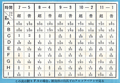 この表は快晴の場合で、曇天の時は2倍にするようにと説明がある。 (アサヒカメラ昭和11年7月号より) |