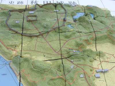 | 秋田城跡の模型 広大な史跡を、歴史公園として整備しつつある。 昭和34年から文部省、秋田県が継続して発掘調査を続け、平成元年からは歴史公園として整備され、平成6年には東門と築地塀が復元された。 |
