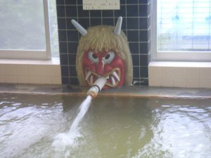 | 雄山閣の温泉 雄山閣の温泉は源泉をそのまま引い ている。間欠泉のように、なまはげが吐 き出す温泉は、なかなかの迫力。上質の ナトリューム泉で本物の満足感ありだ。 |