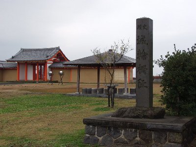 築地塀に囲まれて、政庁の建物群がある。正殿、後殿は柱の位置が示され、その規模が