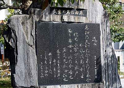 | 越前市役所の前に、武生の地名の起源とされる古代歌謡催馬楽の碑が立っている。 (道の口 武生の国府に 我はありと 親に申したべ 心あいの風や サキムダチヤ) 催馬楽は古代の民俗歌謡で、8世紀末から9世紀にかけて歌われたという。太介不乃己不(武生の国府)は、国府の地名が詠まれた珍しい例で、遠江の見附の国府と2例しか残っていない。サキムダチヤは合いの手だろうか。 |