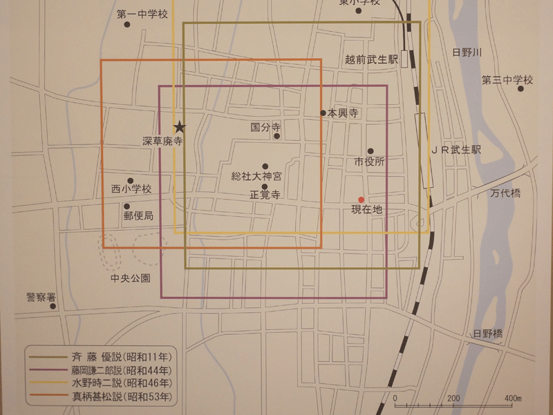 越前国府の推定地は諸説ある。公会堂記念館には主な説の国府域の範囲が表示されていた。 |