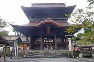| 楼門は嘉永2年(1849)の再建。2層楼山門式の堂々たる楼門で、 高さは21M。神社の神門としては珍しい様式で、仏教の影響が強く出ている。常陸の鹿島宮、筑前の筥崎宮の楼門とともに、日本3大楼門に数えられる。 拝殿は豪壮な入母屋檜皮葺。本殿は3棟あるのだが、拝殿は中央から一度に拝礼する。 参道は楼門、拝殿に対して横向きにつく。参道の北に国造神社、南に阿蘇山が繋がる。 |