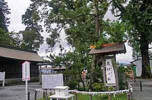 願かけ石は健磐龍命が、祖神に願掛けをしたという磐の一部。深く念じてこの神石を撫でると願いが叶うと言い伝えられている。 阿蘇神社第26代宮司阿蘇友成は、播磨国尾上で、縁起の良い松に出会った。その実を持ち帰り植えたのが、この高砂の松である。 世阿弥の謡曲「高砂」の冒頭に 我こそは、九州肥後国阿蘇の宮の神主友成とは、我がことなり とある。縁結びに霊験あらたかだとか。 |