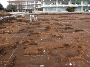 校庭に、常陸国庁の正殿、前殿、南門跡と考えられる掘立建物の跡が発見さ