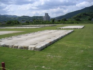 | 国庁官衙群の復元整備 正殿、脇殿、前殿等の官衙群の跡が整備されつつあり、 芝生の上に基壇と礎石が復元されている。 |