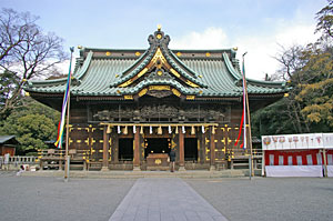 | 拝殿 瓦葺き入母屋破風造りの拝殿。 見事な彫刻が施されている。 |