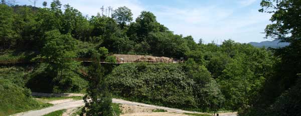 | 加茂岩倉遺跡 ウグイスの声を聞きながら20分ほど歩いてやっと着いた。小高い崖の斜面から出てきたという。見学用の木組みの通路が整備されている。この遺跡全体を見渡せるように資料館が建っていた。 |