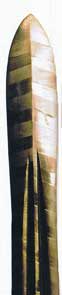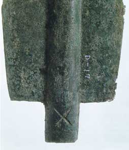 | 銅矛 銅矛は長く重い。長いものは84cm、短いものでも67cmもある。 重さは、重いもので1900g。とても片手では持てない。 右は矛の先端部分だが、研磨角度を変えて綾杉状の文様を 浮かばせている。これは、佐賀平野に出土する銅矛の特徴で 北九州から出雲へ運ばれてきたものだろうという。 |