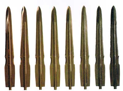 | 銅剣 出来たての銅剣は黄金色に光っている。 長いものは54cm、短いもので48cm。 重さは500g以上。成分は銅85、錫10、鉛5の割合。 |