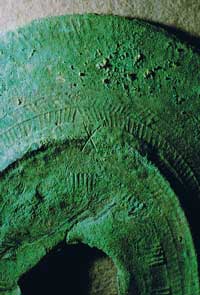| 加茂岩倉遺跡出土の銅鐸 39個の大量出土は我が国に例を見ない。荒神谷の358本の銅剣もそうだが、 出雲の埋蔵品は大量出土で驚かされる。和歌山、兵庫、徳島、奈良などから 出土した銅鐸と同笵のものが多く、各地と交流があったことを思わせる。 右は釣り手の部分に刻まれた「×」印。この刻印のあるものが数点あった。 荒神谷の銅剣の柄の刻印と同じだ。この二つの遺跡を結ぶ謎の手がかりである。 出雲国風土記にいう。 神原の里。 天 大原郡神原郷の起源説話である。風土記が編まれた7世紀には、神の宝物を埋めた所という伝承が残っていたのである。2千年の歳月を経て、現代に姿を現した神の宝は、我々に何を伝えているのであろうか。 平成20年(2008)3月、39個の銅鐸すべてが国宝に指定された。 |