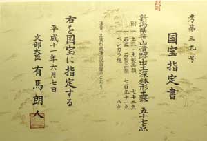 国宝指定書 火焔型土器を含む深鉢型土器57点、 その他土製品、石器など総計928点が 一括して国宝に指定された。 新潟県唯一の国宝である。 |