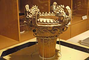 | 1号火焔 2009年7月28日、ちょうどこの日から夏の公開が始まった。写真も自由に撮れるし、見学者も多くないので、5千年前の縄文人の美への情熱に、心ゆくまで向かい合うことが出来た。鶏のトサカに見立てた鶏頭冠と呼ばれる4対の装飾が目を引く。燃え上がる炎を思わせる力強い造形だ。パリやワシントンでも公開され好評を博した。高さ46.5cm。 |