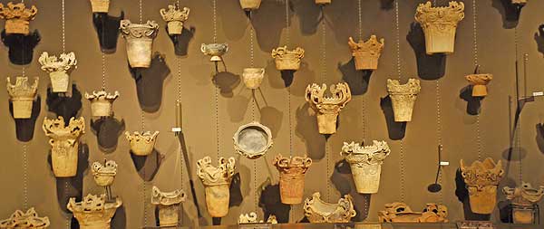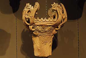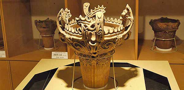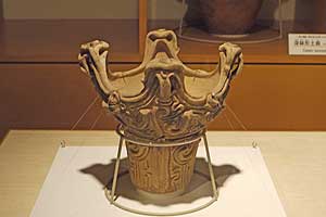 王冠型土器 no16 4個の短冊形突起を持つものを 王冠型土器と呼ぶ。 器面の文様は火焔型と似るが、 口縁部から4個の突起が スムースに立ち上がる。高さ26.2cm。 |