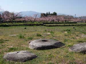 | 笛吹川から分かれた金川を東へ渡ると、国分寺跡へ出る。 甲斐国分寺の碑と、いくつかの礎石が、国分寺の在りし日の姿を語っている。