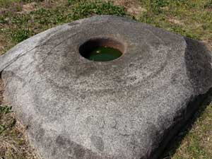 心礎 一辺2.2Mの巨大な礎石で 柱座の径は43cm。 深さ22cmの真円の柱穴を穿つ。 |
