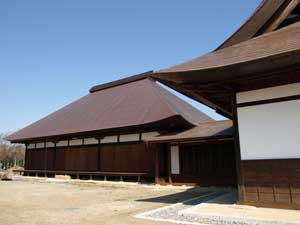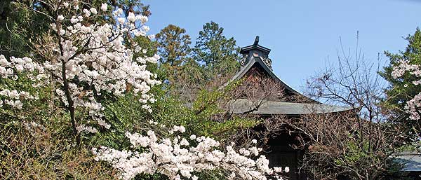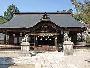 | 拝殿 破風付きの入母屋造りで、 寛文12年(1672)の建立。 屋根は檜皮葺の上に銅板をかぶせた 美しい造りだ。 |