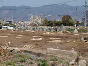 | 金堂跡の発掘現場 今まであった国分寺の本堂を取り壊し、古代国分寺の金堂を発掘している。 旧講堂跡の礎石は、金堂跡の北側の墓地の中に、20数個が点在している。 |