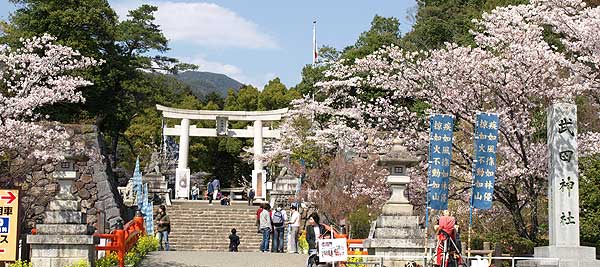 | 武田神社 満開の桜が歓迎してくれた。信虎、信玄、勝頼の武田三代60年の栄華の跡である。 |