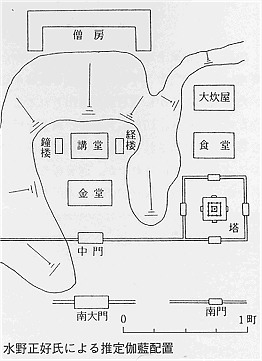 河内国分寺の伽藍配置は、特異な ものである。 立地する地形によるものだろうが、 中門、金堂、講堂などの主要伽藍 と離れて、別の尾根に塔を建てたと 推定されている。 武蔵国分寺なども、塔がかなり離れ て建てられているが、ここ河内国分 寺もきわめて異例である。 国府からも4KMも離れたこのような 場所へ、河内国分寺はなぜ建って いるのだろうか。 国分寺建立の裏の立役者光明皇后 は、安宿姫といったが、ここ河内国の 安宿郡と何か関係があるのだろうか。 (右図は柏原市歴史資料館より) |
