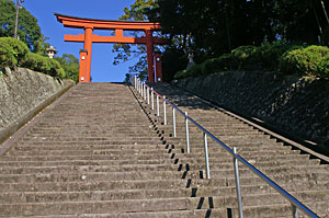 | 石段上の鳥居 高い石段の上に、鮮やかな朱塗りの鳥居が 目につく。印象的なたたずまいである。 |