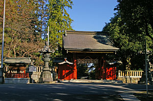 総門 100段の石段を登り、大鳥居をくぐり 中山道の姫街道を渡ると総門に出る。 |